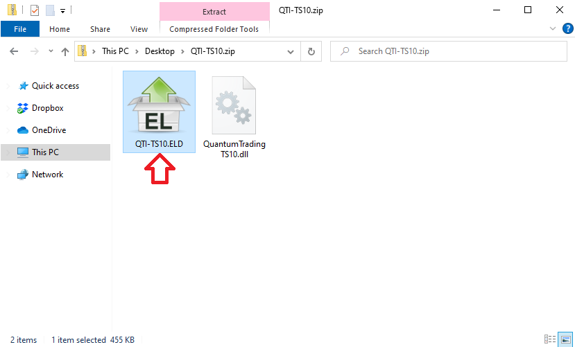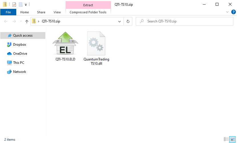 - In the menu, select Open with > Windows Explorer. This opens a window that displays the contents of the ZIP file: QuantumTradingTS10.dll and QTI-TS10.ELD